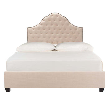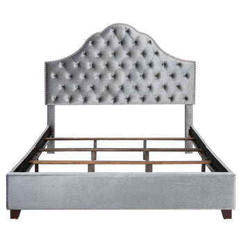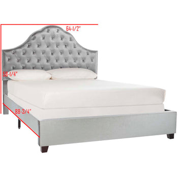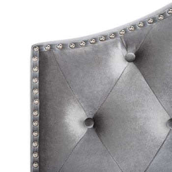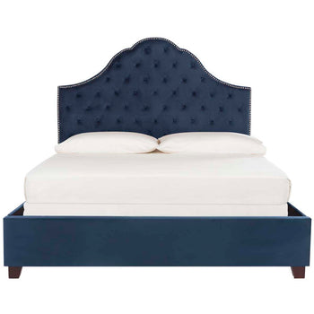 Embrace the art of sleep with the grace and grandeur of this contemporary bed. Finely crafted with plush navy velvet upholstery from top to bottom, its deluxe tufted detail and polished nickel nailheads ensure a soothing, sophisticated bedroom.