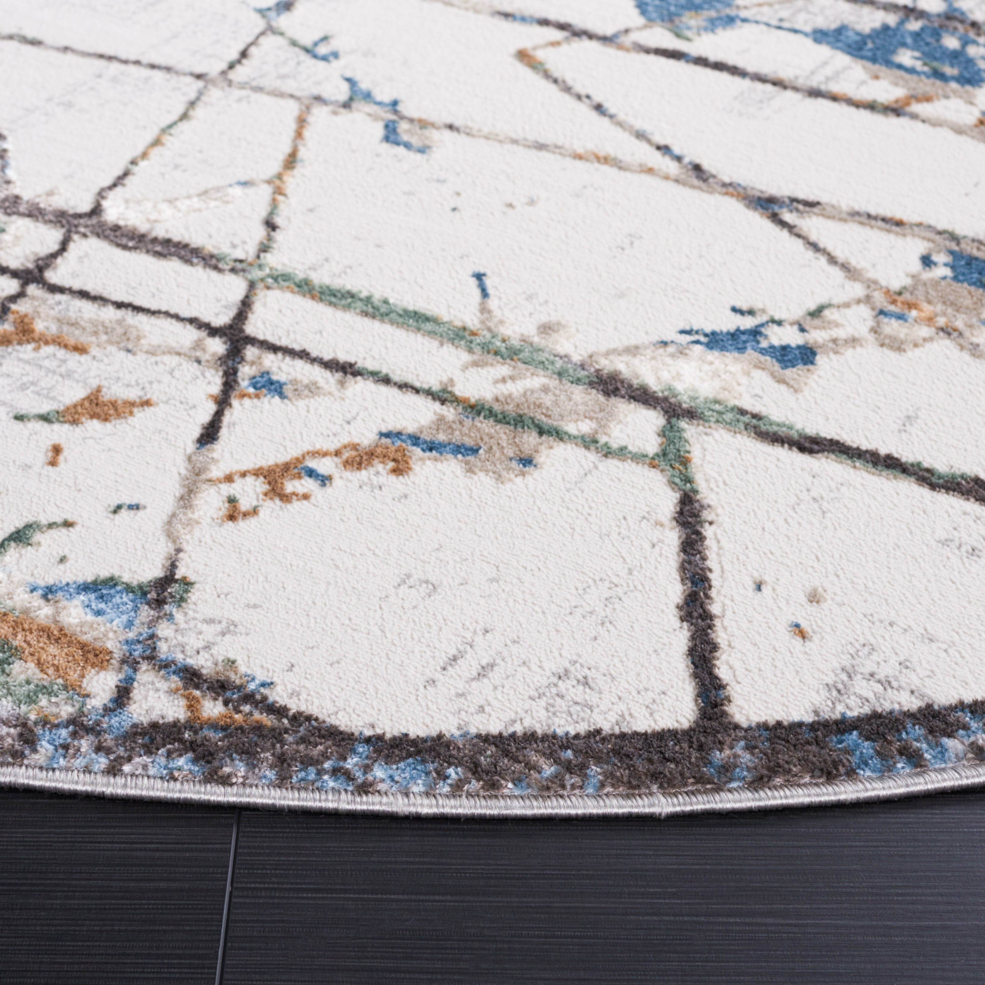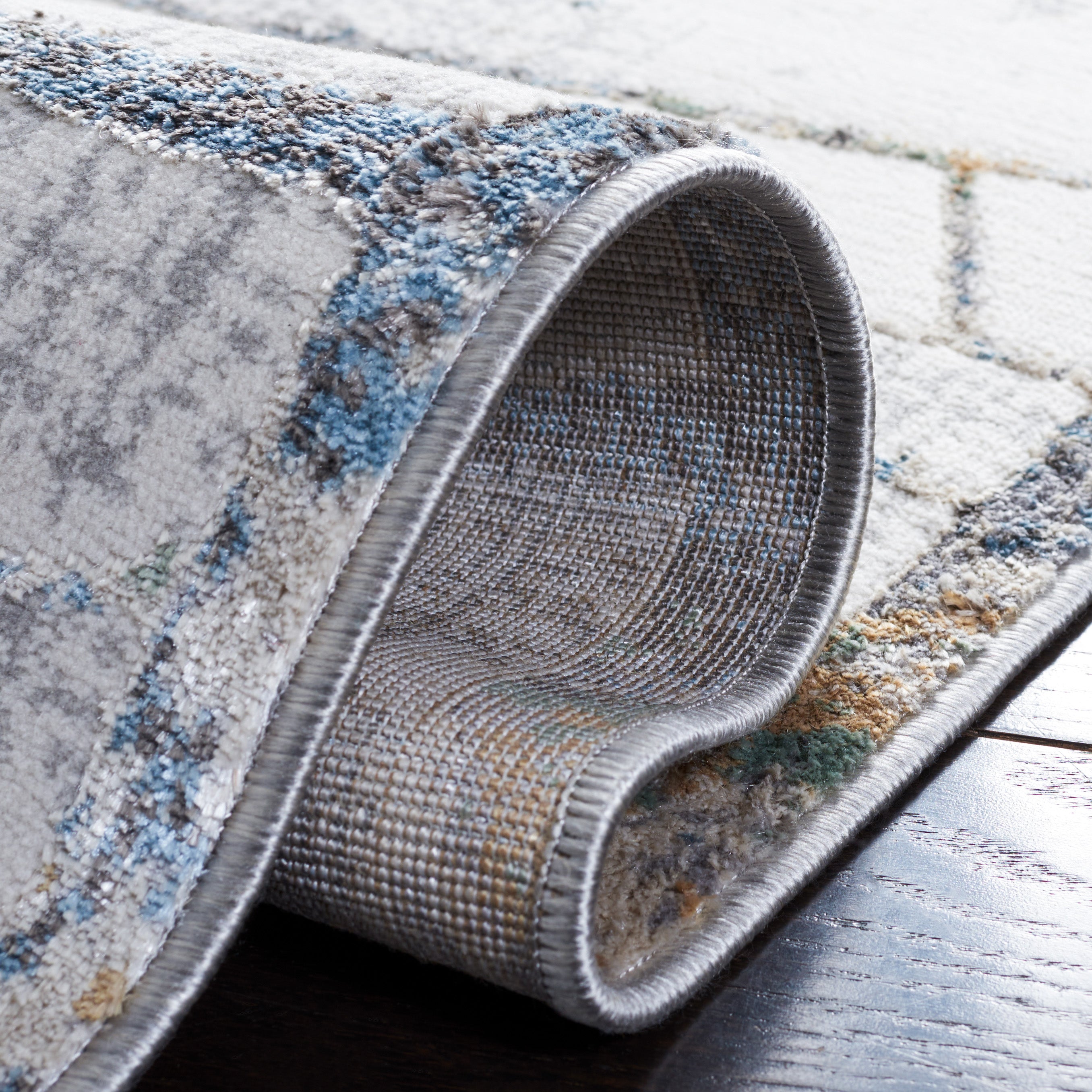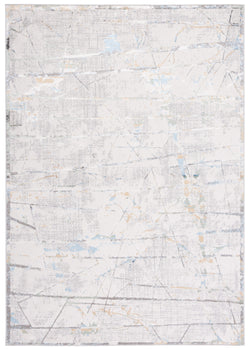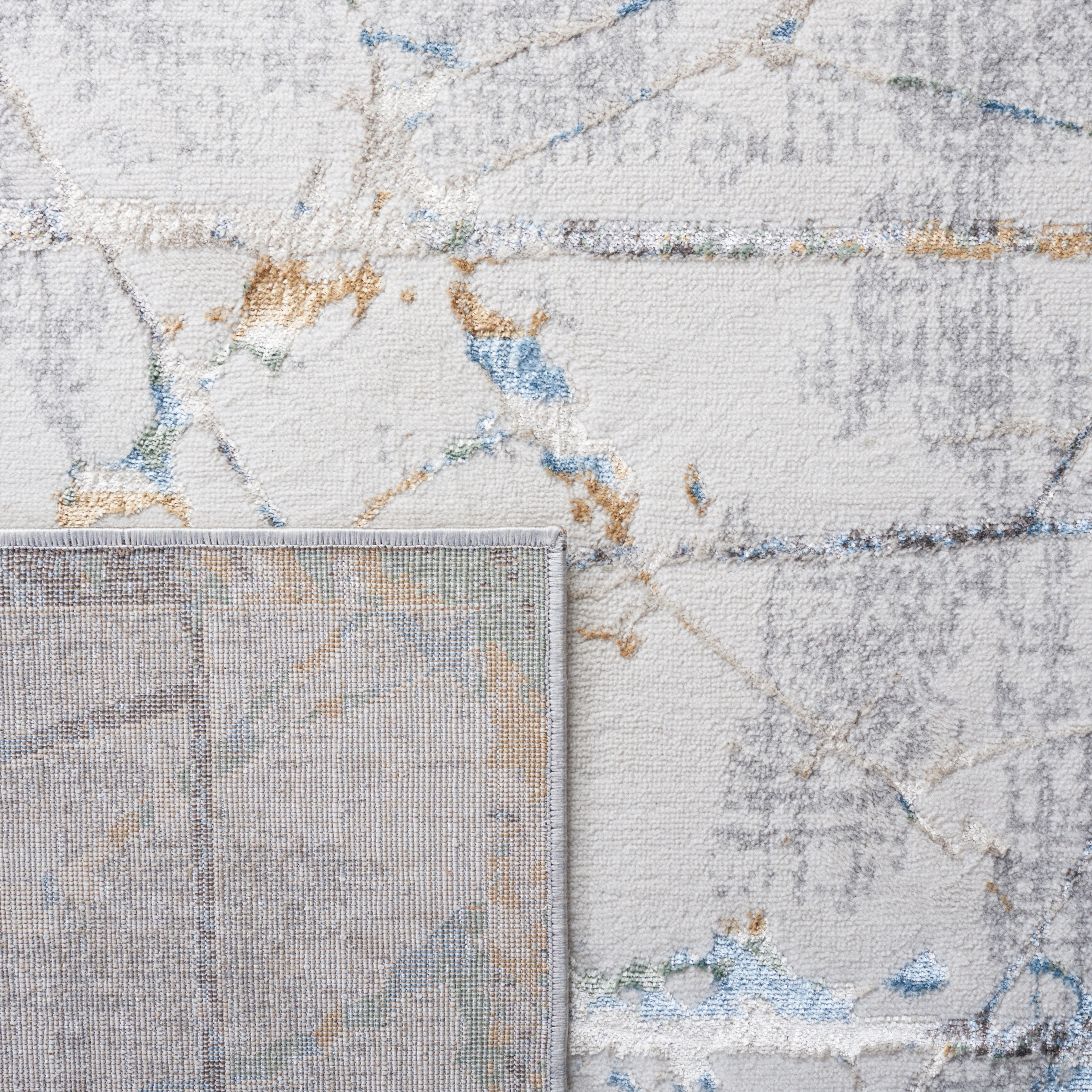 Delight in the artful mix of textures and shades that dance across the surface, where hints of blue and soft gold tones delicately complement the neutral backdrop. This rug is a canvas that captivates and harmonizes with its surroundings, inviting a sense of calm and modern flair into any room.