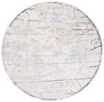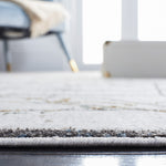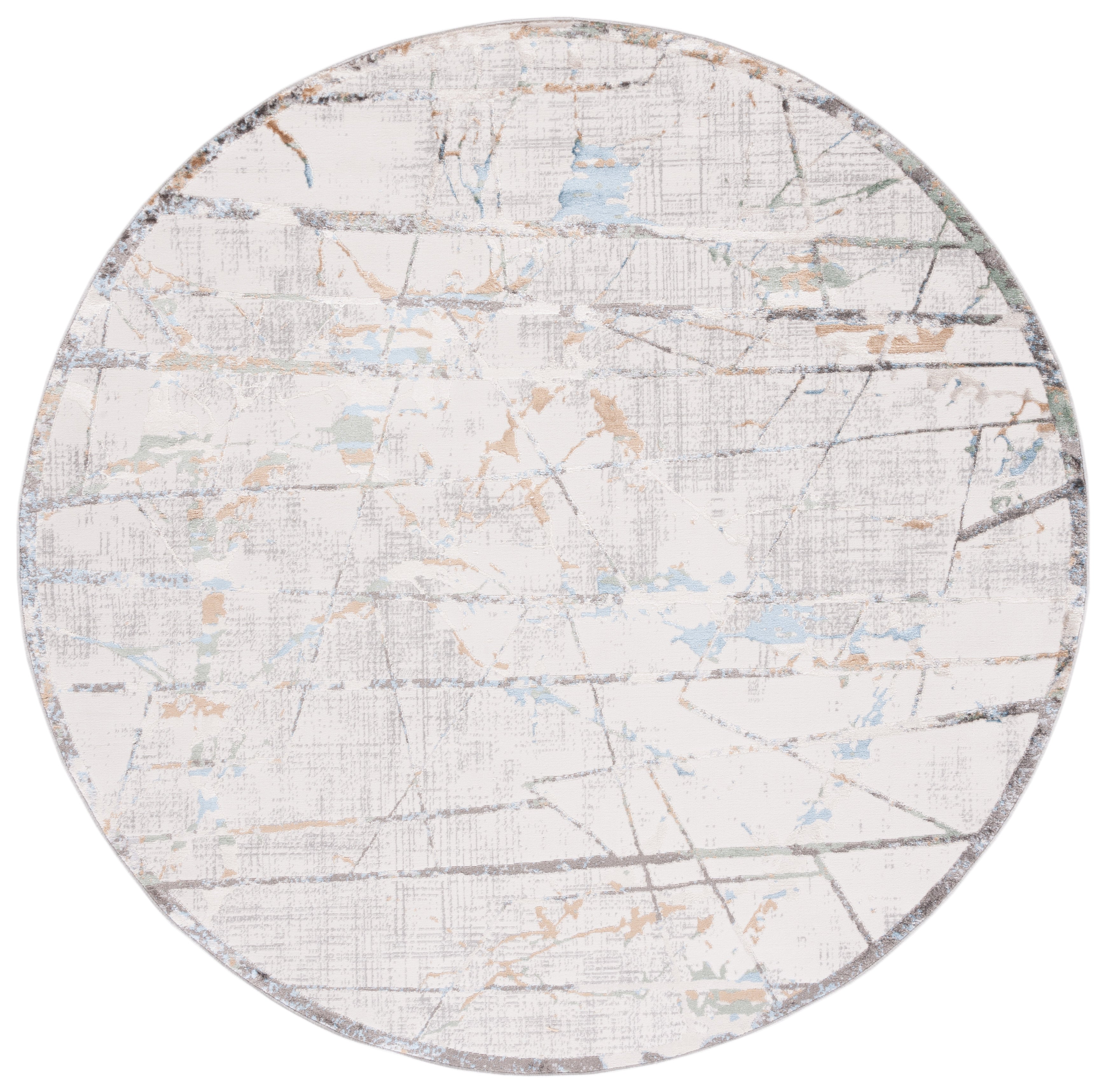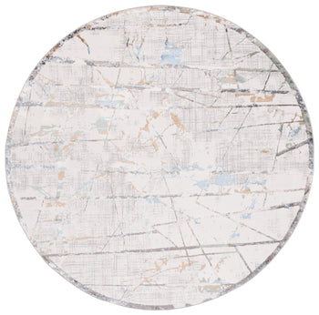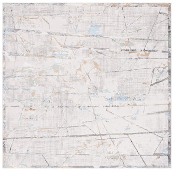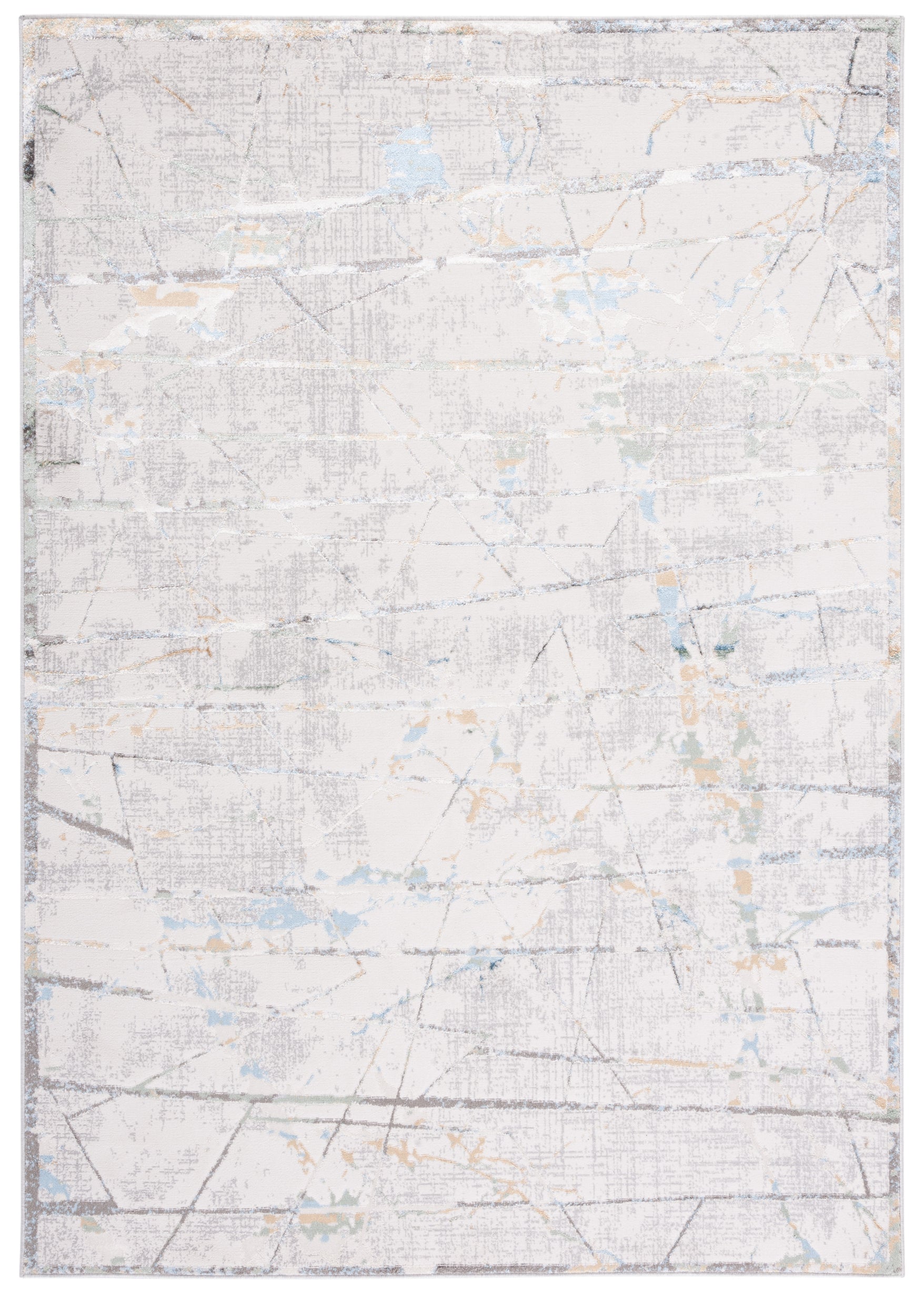 Delight in the artful mix of textures and shades that dance across the surface, where hints of blue and soft gold tones delicately complement the neutral backdrop. This rug is a canvas that captivates and harmonizes with its surroundings, inviting a sense of calm and modern flair into any room.