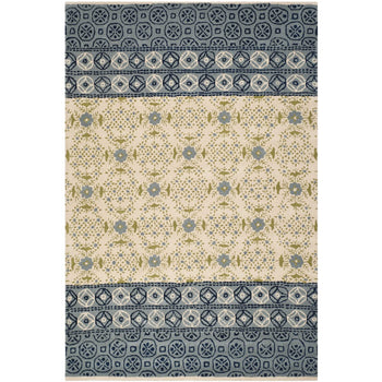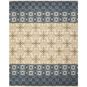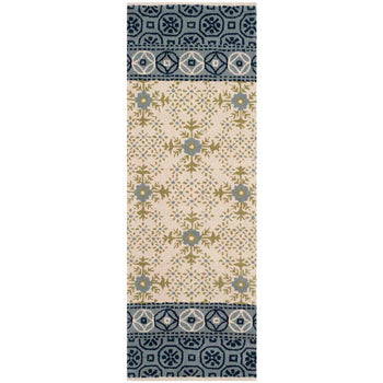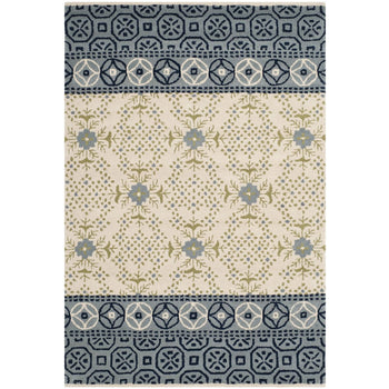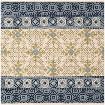 The rug's pattern, as seen in the image, features intricate geometric and botanical motifs that give it a rich and detailed appearance. The central area highlights a cream-ivory base with a harmonious display of foliage and floral designs, accented with varying shades of blue and olive green. The border showcases a complementary pattern with darker hues, framing the piece beautifully.