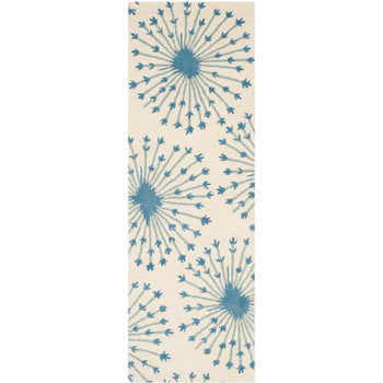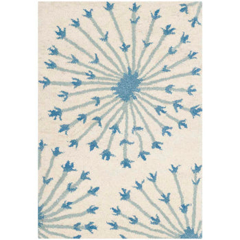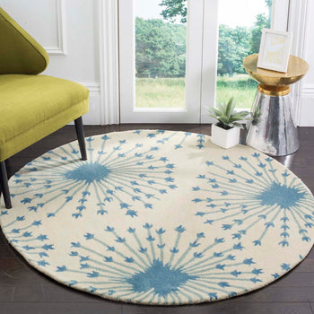 This rug features a captivating pattern that exudes a sense of organic symmetry and harmony. Radiating from the center in a starburst design, the beige and blue color palette is soothing and versatile, complementing a variety of decor styles. The pattern, regardless of its size in the image, provides an attractive focal point in your room.