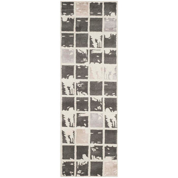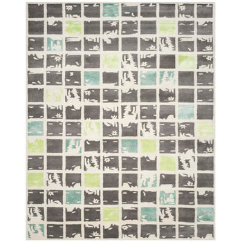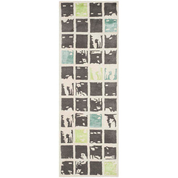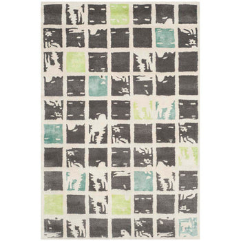 Each square of the pattern tells a different story, forming an eclectic mix that captivates and delights. The pops of green amidst the neutral tones bring a subtle yet refreshing burst of color, ensuring this rug stands out without overwhelming the room. This 2' X 3' area rug, although small in stature, promises to make a grand statement in any setting.