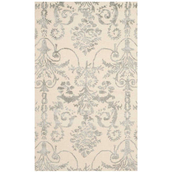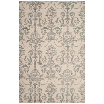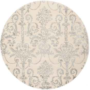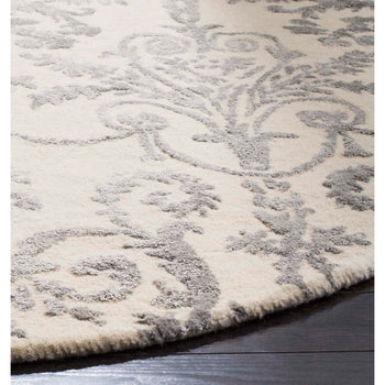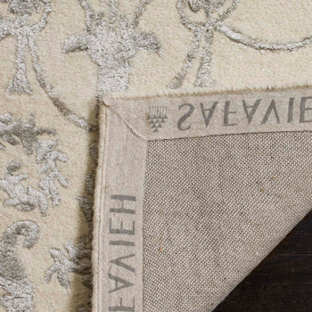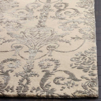 The sophisticated ivory and grey color palette provides a serene and versatile backdrop for the intricate pattern that adorns the rug. Drawing inspiration from classical design, the motif features elegant florals and scrollwork that exude an air of elegance and refinement.