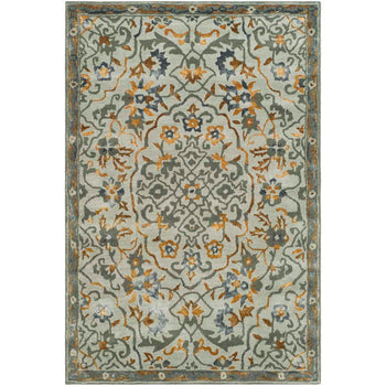 Drawing inspiration from timeless designs, the rug features an intricate pattern that combines floral and ornamental motifs, blending harmoniously to create a striking centerpiece for your floor. The subtle grey background is accented with rich gold details, providing a refined and opulent touch that complements both modern and traditional decor.