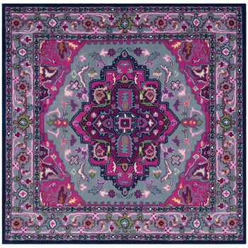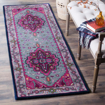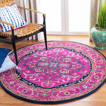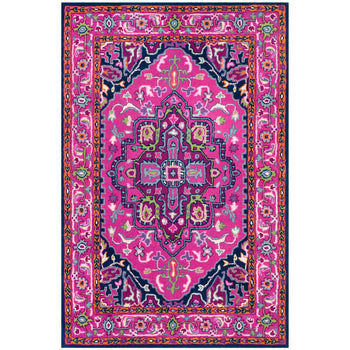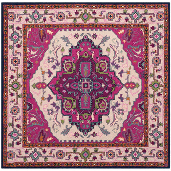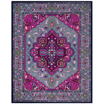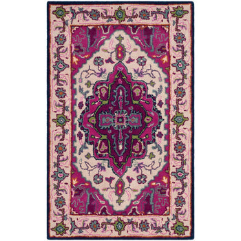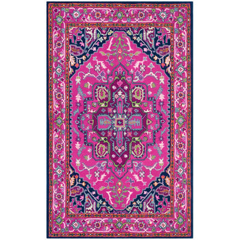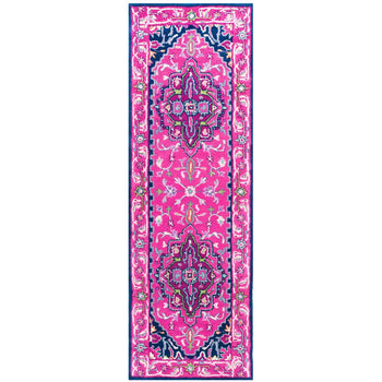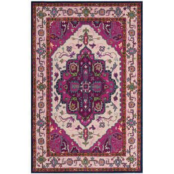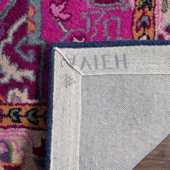 Handmade with precision in India, the rug showcases an entrancing pattern that combines time-honored motifs with a contemporary color palette. The central medallion, reminiscent of classic Persian designs, is the focal point, enveloped by intricate florals and accentuated with hints of ivory and vibrant pink hues. Bound to capture attention, the rug's border echoes the complexity and charm of the centerpiece, rounding off the design with symmetry and grace.