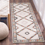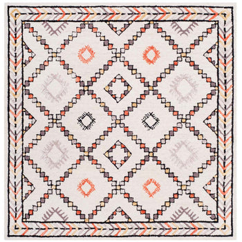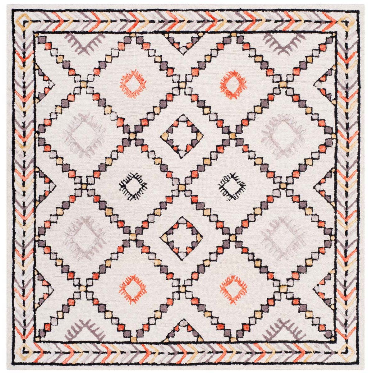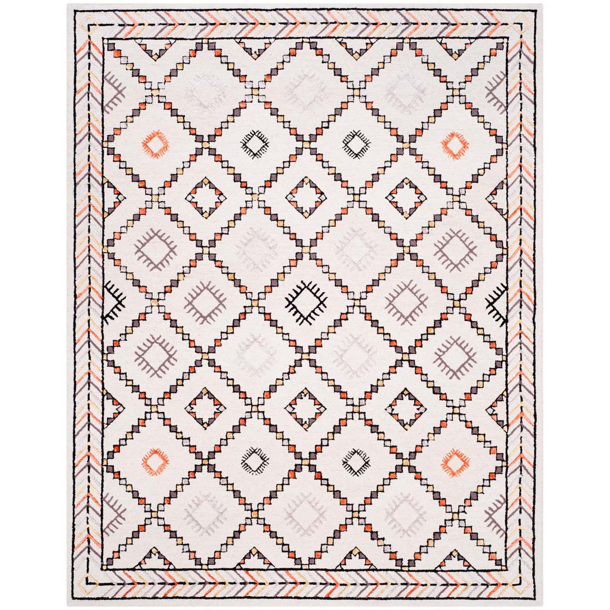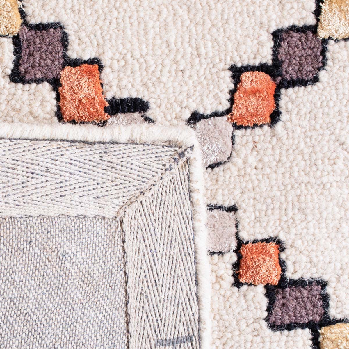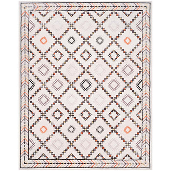 We've designed this rug with accentuating shape in mind to tastefully complement your interiors, drawing the eye with its intricate pattern work and inviting colors. The design showcases traditional motifs, enhanced with a contemporary twist, presenting an array of geometric patterns, bordered by a unique and stylized frame. Hues of burnt orange, charcoal, beige, and a splash of vibrant red intermingle on a creamy ivory backdrop, creating a stunning visual spectacle that is bound to be a conversation starter.