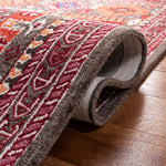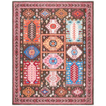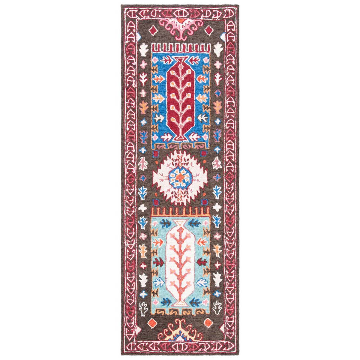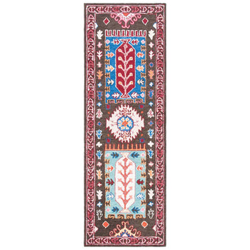 Our runner boasts a captivating palette of rich browns and warm rust hues, creating an environment of warmth and welcoming luxury. The contemporary design features bold, symmetrical patterns, mixing traditional motifs with modern flair. The central imagery showcases leaf-like figures flanked by geometric shapes, while the border complements the design with a series of intricately detailed elements, providing a beautiful frame to this work of art.