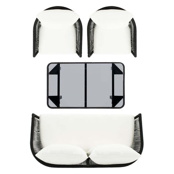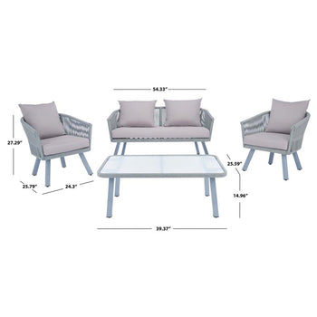 The classic barrel chair gets a streamlined modern update in this Belmi 4 Piece Outdoor Living Set. Featuring two arm chairs, a loveseat, and smooth glass top coffee table, the timeless silhouettes of Belmi's seating is transformed for today's outdoor entertaining with grey rope details and plush beige cushions.