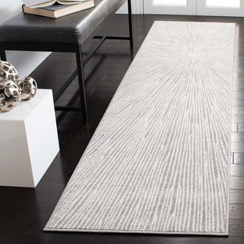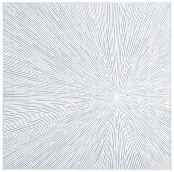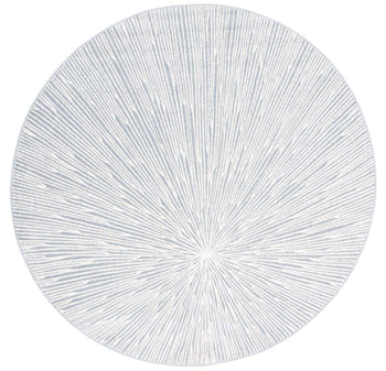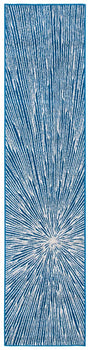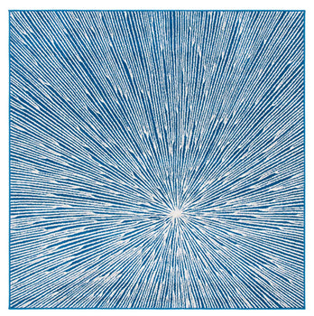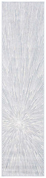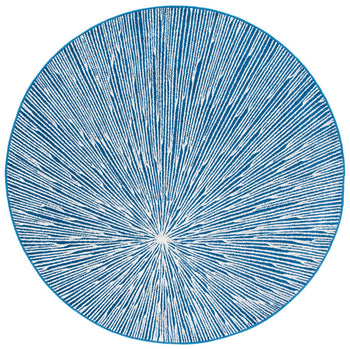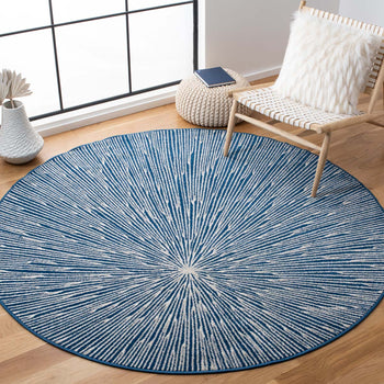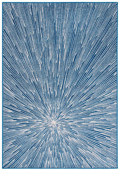 The rug features a compelling abstract burst pattern, radiating from a central point, creating a dynamic visual effect that captures the eye. The contrasting navy blue and grey hues are power-loomed to precision, employing state-of-the-art technology that ensures a design with crisp, clean lines and lasting wear.