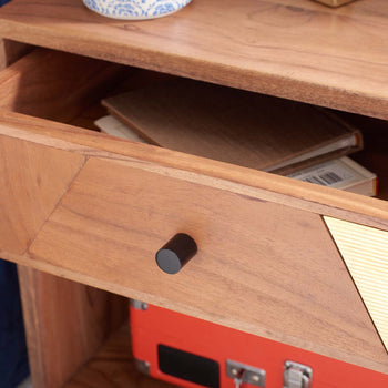 An extraordinary study in mixed media elegance, this Benford 1 Drawer Nightstand overflows with contemporary charisma. Benford's contrasting wood grains and brass applique make for decadent visual intrigue, perfectly enhancing its rustic-styled frame in a soft natural finish.