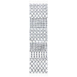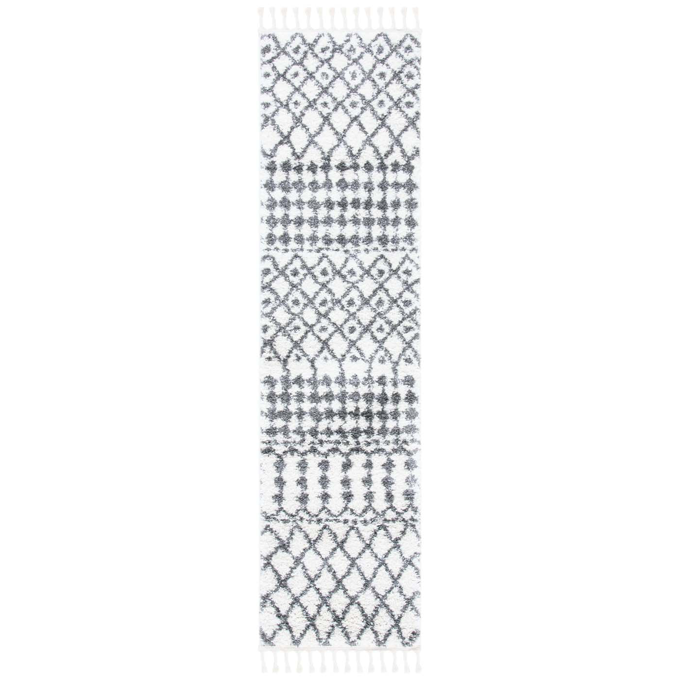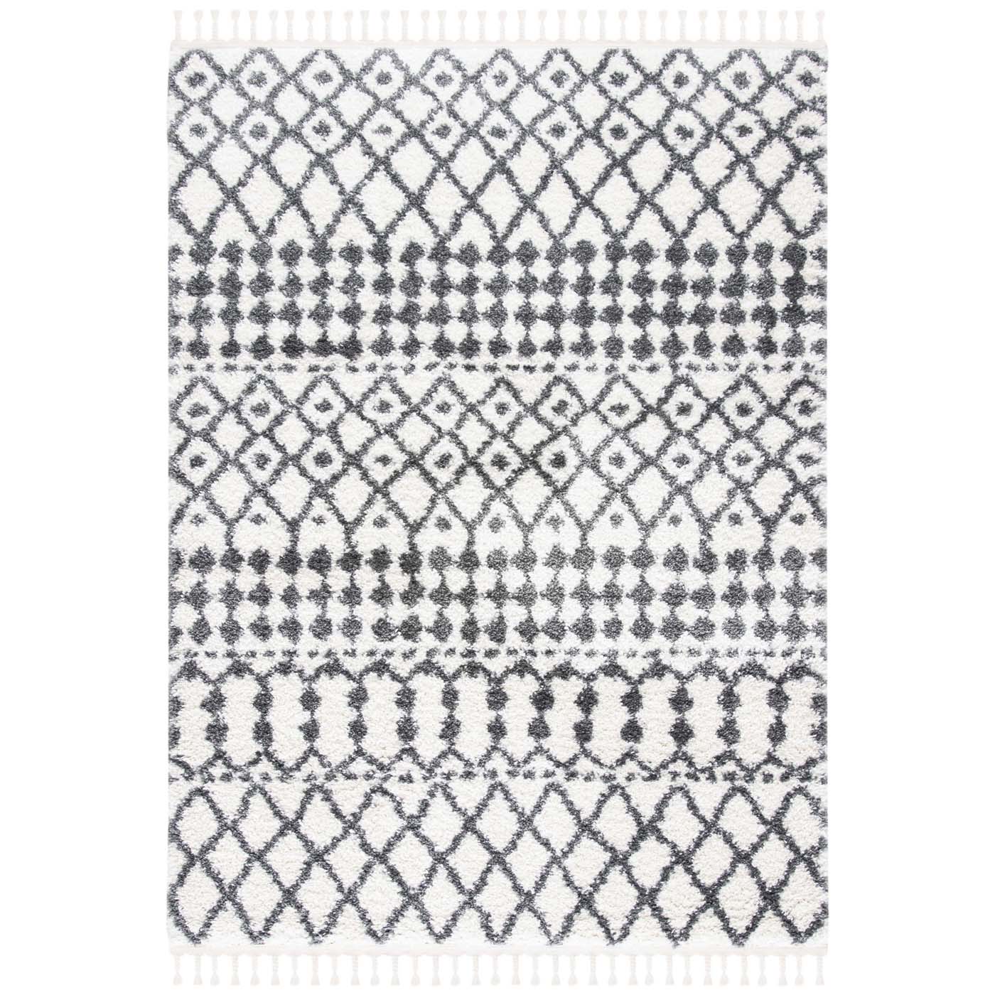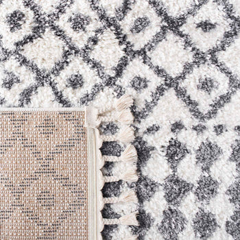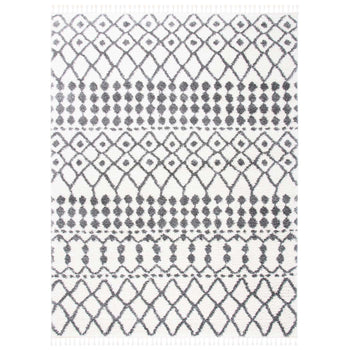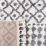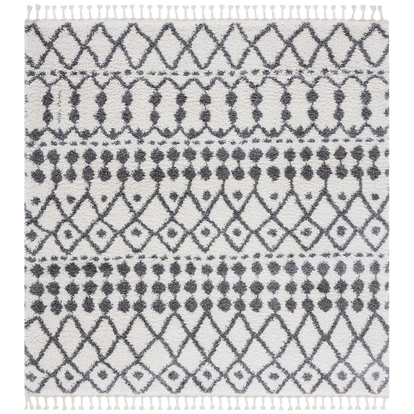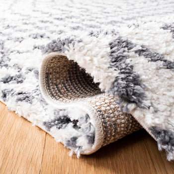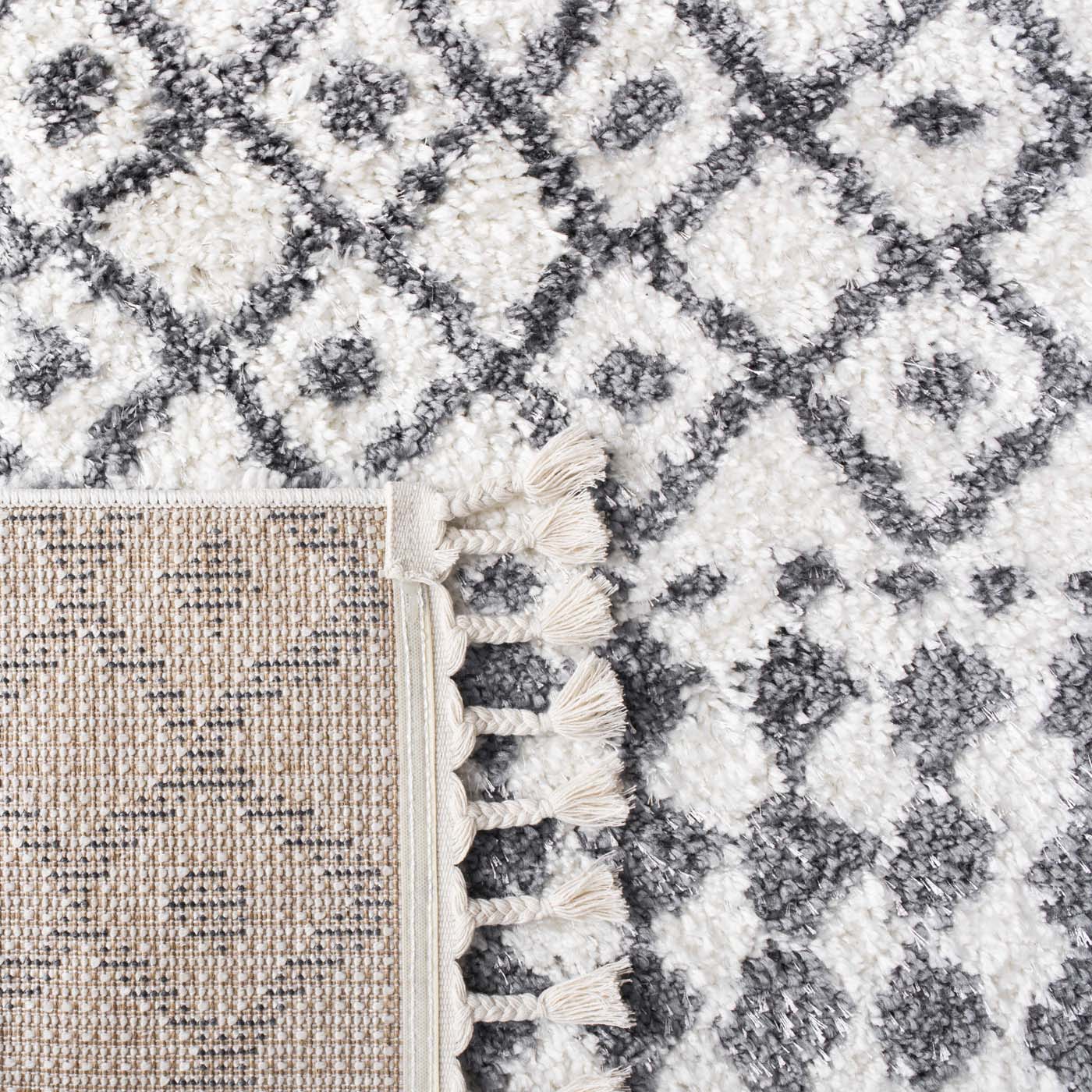 Design-wise, this rug features a Shag & Flokati style that brings a modern yet cozy ambiance to any room. The timeless pattern displayed on the rug, as shown in the image, showcases a harmonious balance of ivory and dark grey hues, creating a captivating geometric diamond motif that will complement both contemporary and classic interiors.