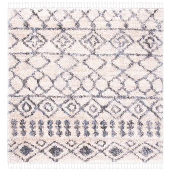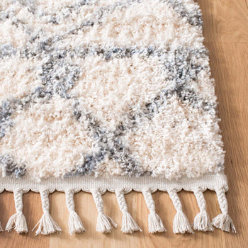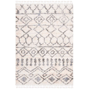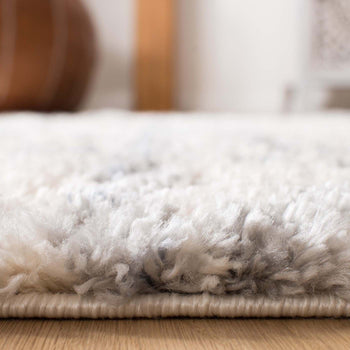 The elegant cream and grey color palette is beautifully showcased in a detailed shag and Flokati style pattern that evokes a sense of traditional charm with a modern twist. From the sophisticated interplay of diamond motifs to the intricate border designs, every aspect of the rug's pattern exudes craftsmanship and attention to detail.