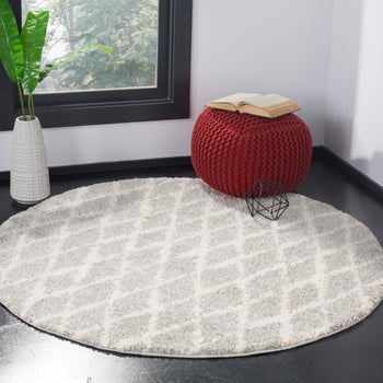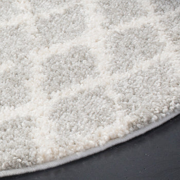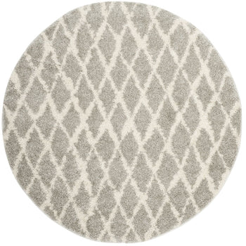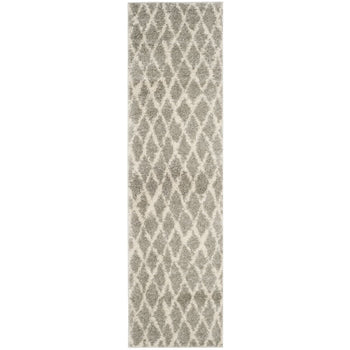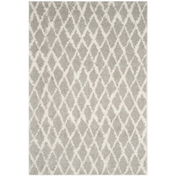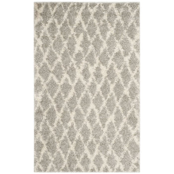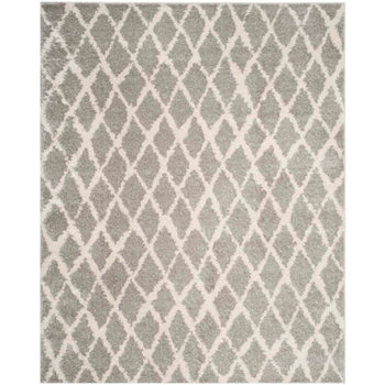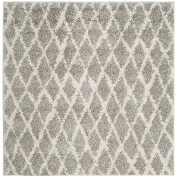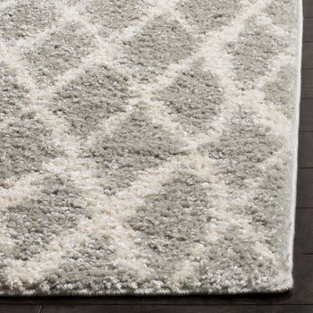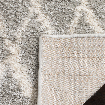 This exquisite piece features a light grey and cream color palette, imparting a serene and versatile charm to any room. The height of 1 1/8" offers a lush, shaggy texture underfoot, perfect for those seeking a cozy and inviting atmosphere. The Shag & Flokati style brings a touch of effortless opulence to your decor, while the intricate diamond pattern showcased in the image provides a timeless geometric aesthetic that complements both traditional and contemporary interiors.