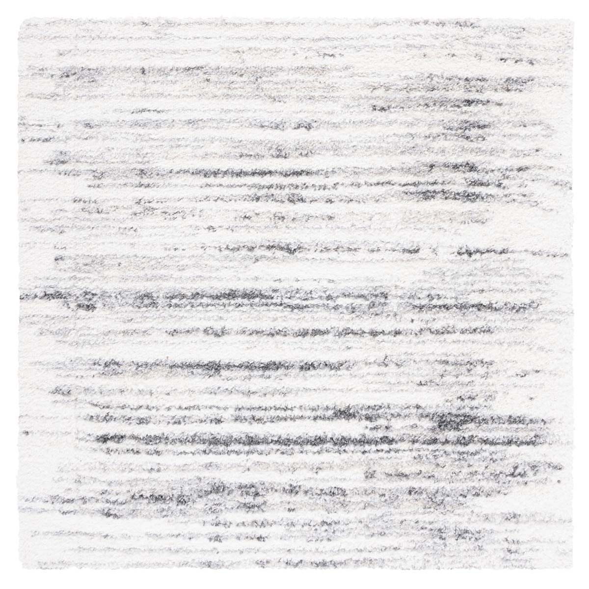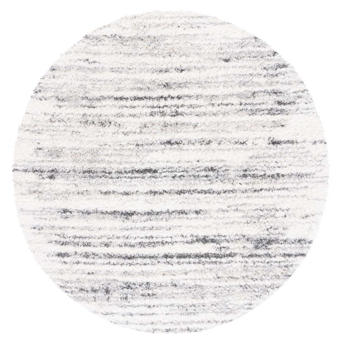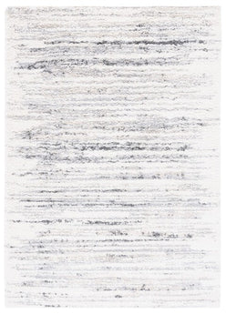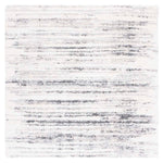 The rug's design features a captivating pattern with variegated horizontal stripes that offer a visual texture and depth to the grey tones upon the ivory background. This nuanced patterning adds a sense of movement and modernity that will complement a variety of home decors.
