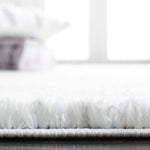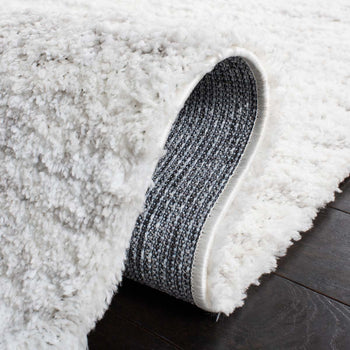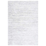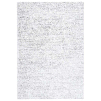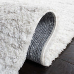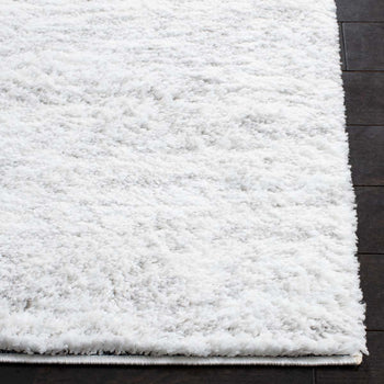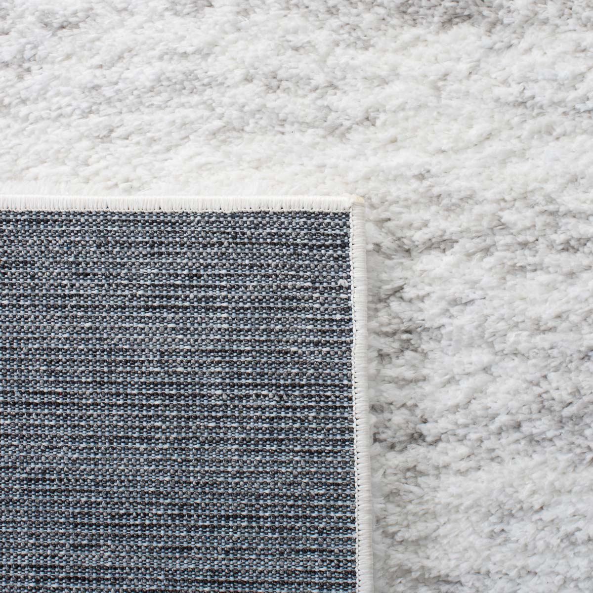 The beautiful ivory and light grey color palette of this rug creates a serene and sophisticated atmosphere in any room. A shaggy 1 1/4-inch pile height invites you to sink your feet into its softness, while the flat weave construction ensures durability and longevity.