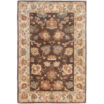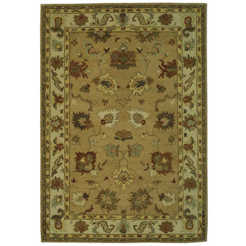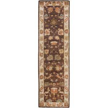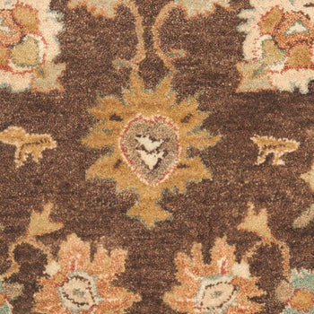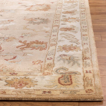 Our rug features a classic pattern, showcasing symmetrical floral motifs and intricate border detailing, reminiscent of ancient tapestries. The warm taupe backdrop is gracefully adorned with accents in soothing ivory and complementing shades, creating a harmonious and inviting atmosphere in your home or office.