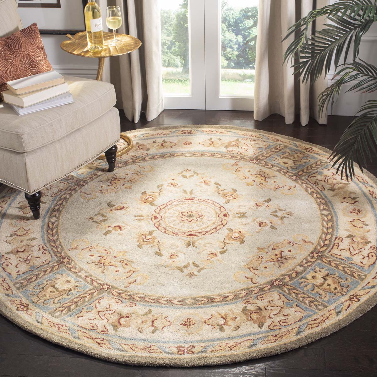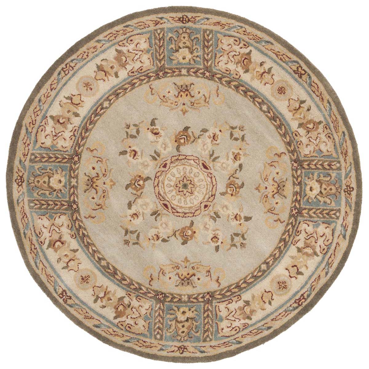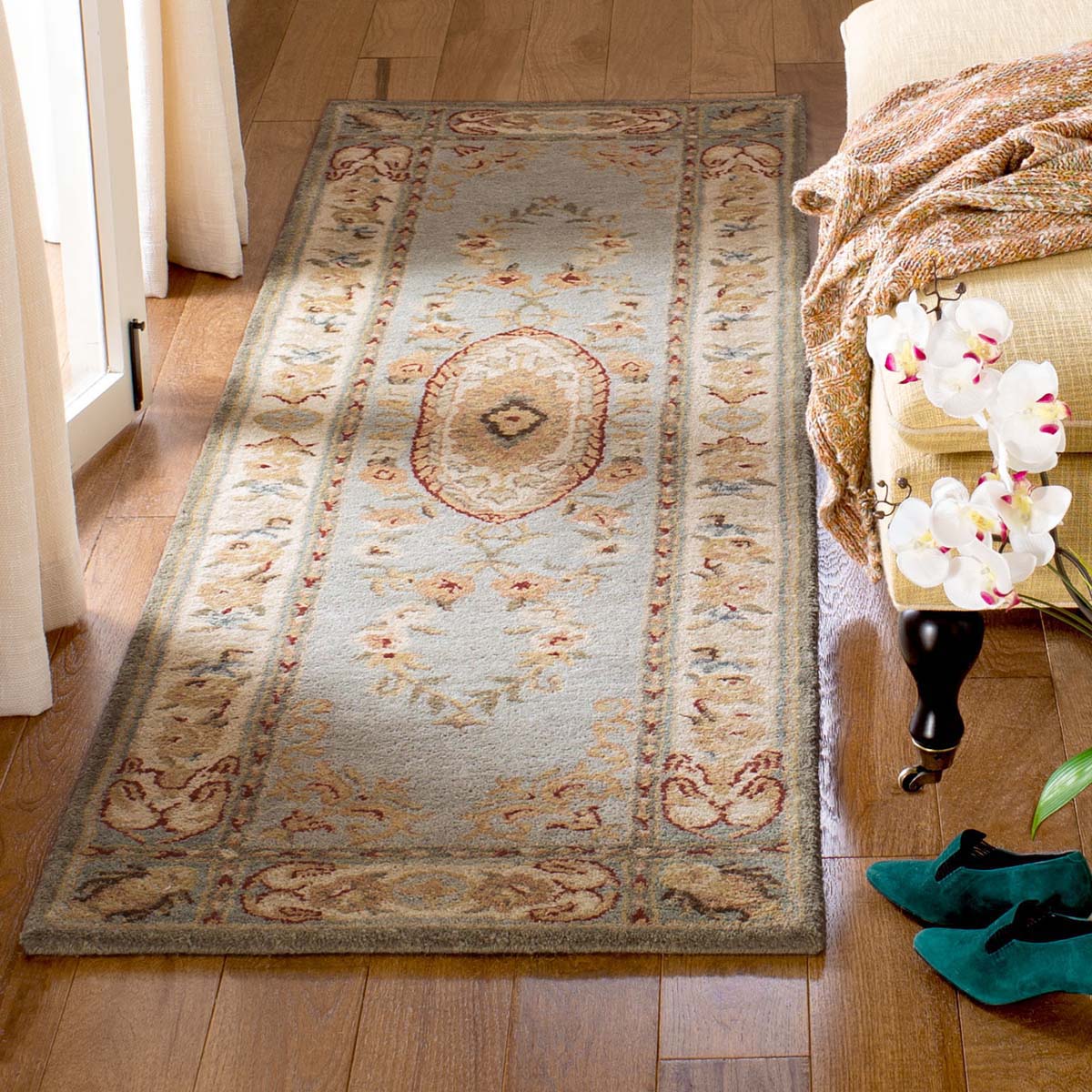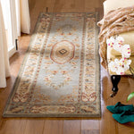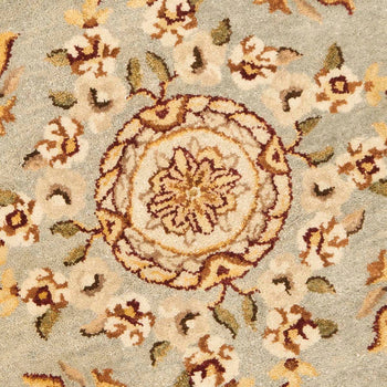 The intricate pattern, inspired by classical designs, showcases an elegant central medallion surrounded by scrolling vines and floral motifs, framed by a contrasting border. Each detail is meticulously tufted by skilled artisans, creating a piece that is as durable as it is beautiful.