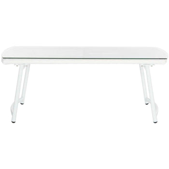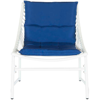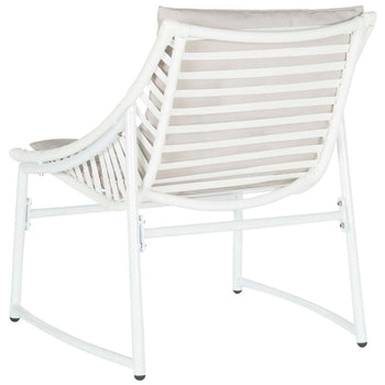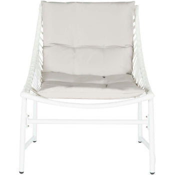 Raise the style quotient of your patio with the 4 piece white rattan Berkane outdoor furniture set with grey all weather cushions. A contemporary strap effect on seating of powder coated aluminum inspired the design of the coordinating coffee table.