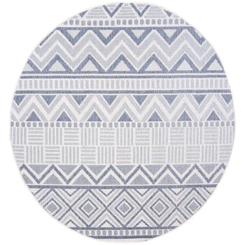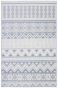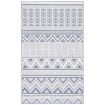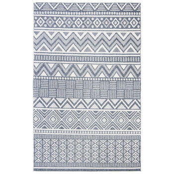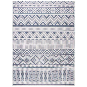 The geometric design of the rug, as can be seen in the image, features an intricate mix of cream and navy patterns that exude sophistication and can seamlessly blend with your current decor. The harmonious combination of diamond motifs, precise lines, and chevron patterns creates a visual symphony that will captivate and charm your guests.