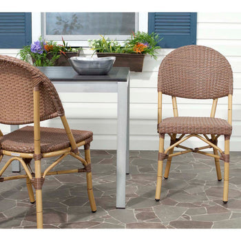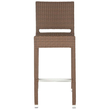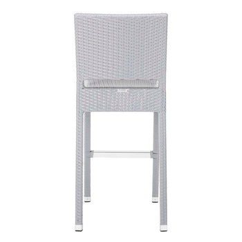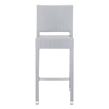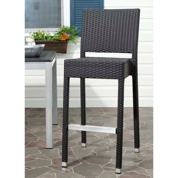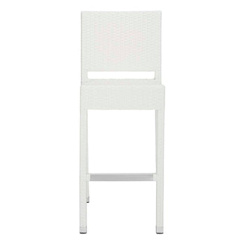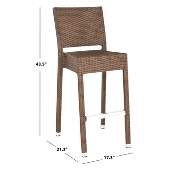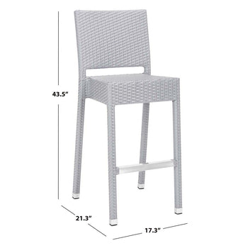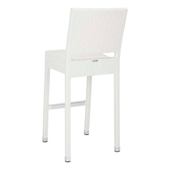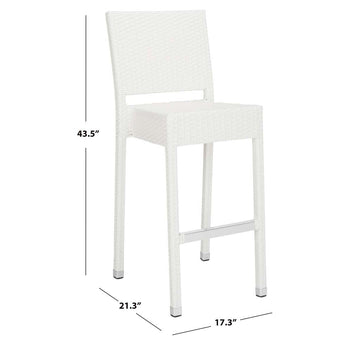 A perfect balance of design and utility, the Bethel indoor outdoor bar stool by Safavieh looks as chic at the kitchen island as it does on the patio. Crafted of easy care white wicker with an aluminum frame, and trimmed with contrasting footrest and caps in silver, Bethel is transitional in style.
