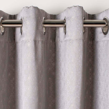 The Safavieh Bilra Window Panel's veiled styling beautifully captures the glam and glitz of penthouse living. A cool grey embroidered design adorns the silky soft synthetic fabric for a look as unpretentious as it is posh. The resilient blackout backing material ensures complete privacy while sleek polished metal grommets make for easy installation.