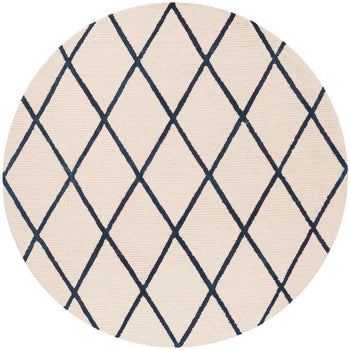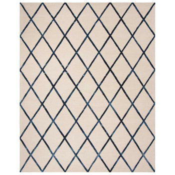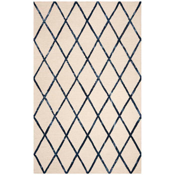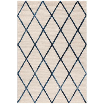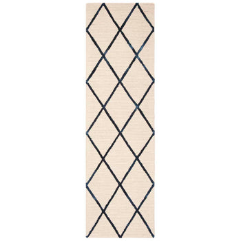 The color palette of ivory and navy is both classic and versatile, ensuring that this rug complements a wide array of interior decors, from modern minimalist to traditional. The bold geometric pattern, featuring diamonds within diamonds, creates a sense of rhythm and structure that captivates the eye without overwhelming the space.