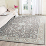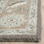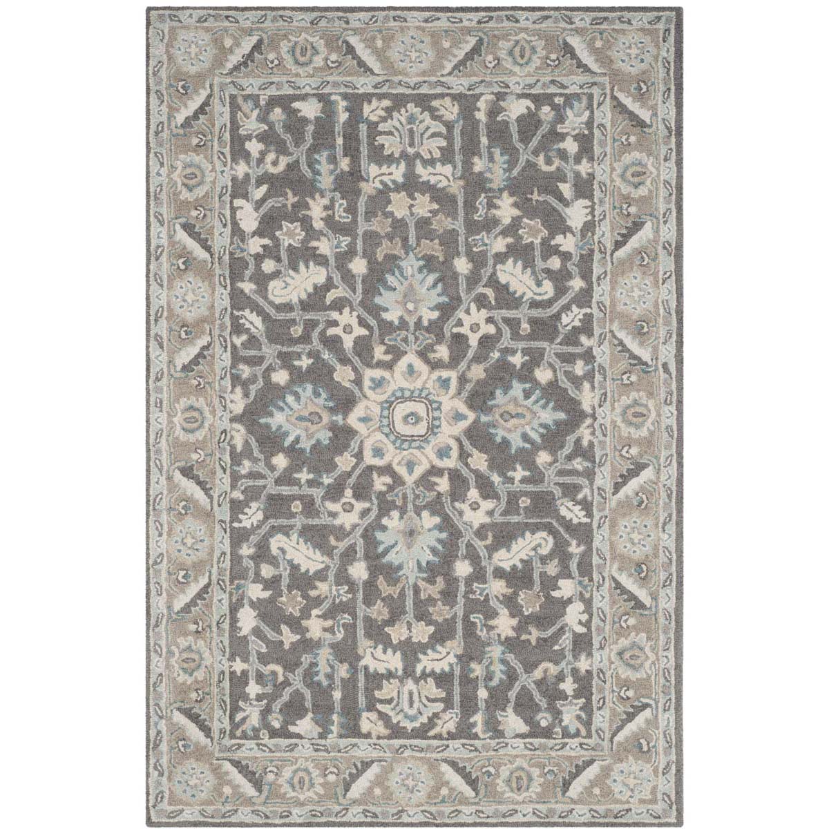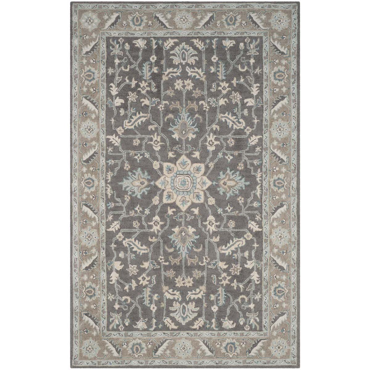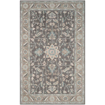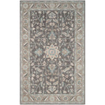 The rug boasts a harmonious blend of dark grey and light brown shades, gracefully combined to form a sumptuous color palette. This luxurious piece features a traditional pattern with intricate floral and geometric motifs that exude an air of classic charm and character. The artful design, with its symmetry and balanced composition, is a testament to the skilled craftsmanship of its creators.