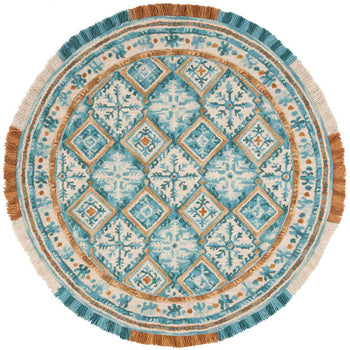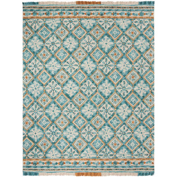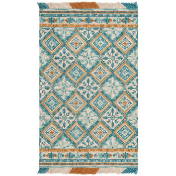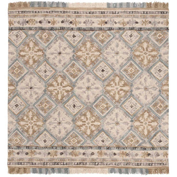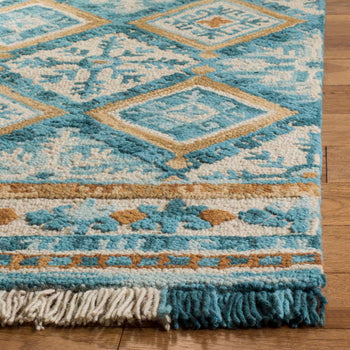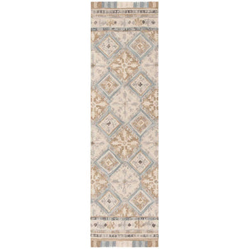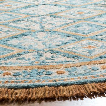 The rug's colour palette of beige and light blue exudes tranquillity and warmth, seamlessly blending with a variety of decor schemes. The intricately detailed pattern as seen in the image features a harmonious combination of geometric shapes and traditional motifs, creating a sense of rhythm and visual interest that captivates the eye.