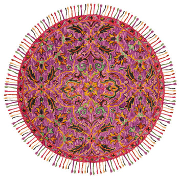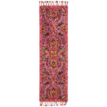 Inspired by the rich heritage of Indian textile design, the rug pattern displayed in the image exhibits a beautiful array of floral and ornamental motifs, interwoven in a mesmerizing lattice of color and form. The fringe tassel details, a playful touch, evoke the look and feel of traditional craftsmanship.