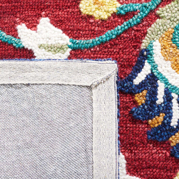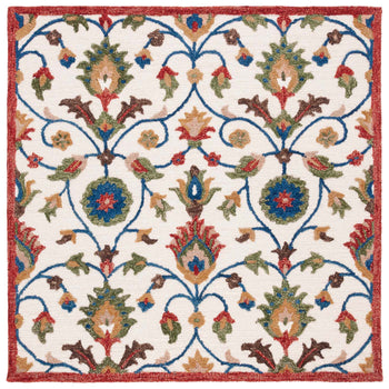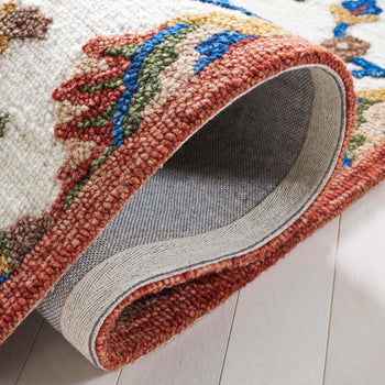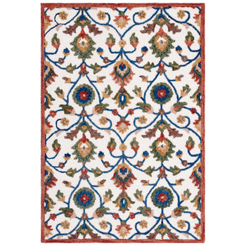 The ivory base of the rug offers a neutral backdrop that highlights the rich green motifs, while a symphony of complementary colors like vibrant red, serene blue, earthy browns, and touches of golden yellow come together to form an intricate pattern reminiscent of classic floral designs and traditional craftsmanship.