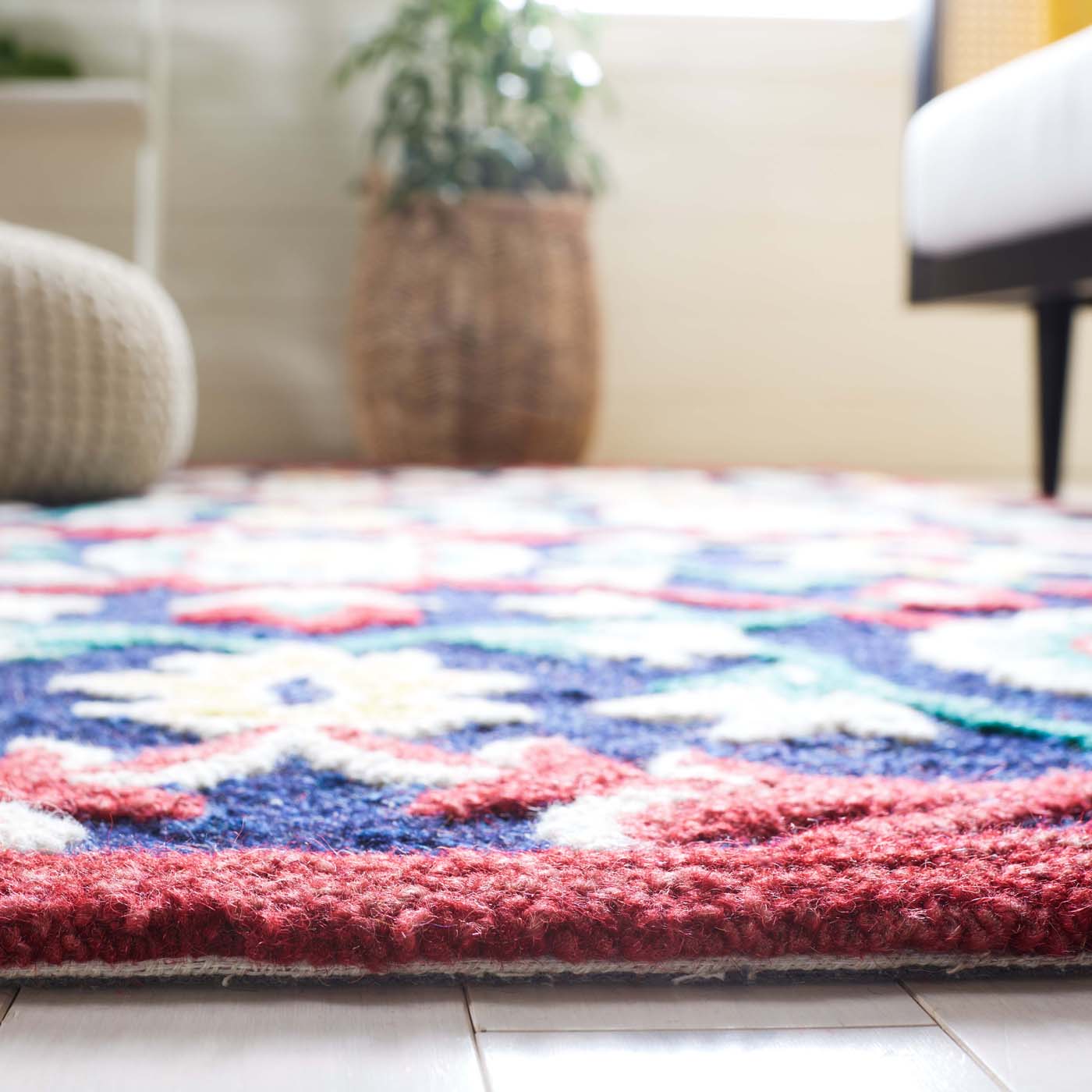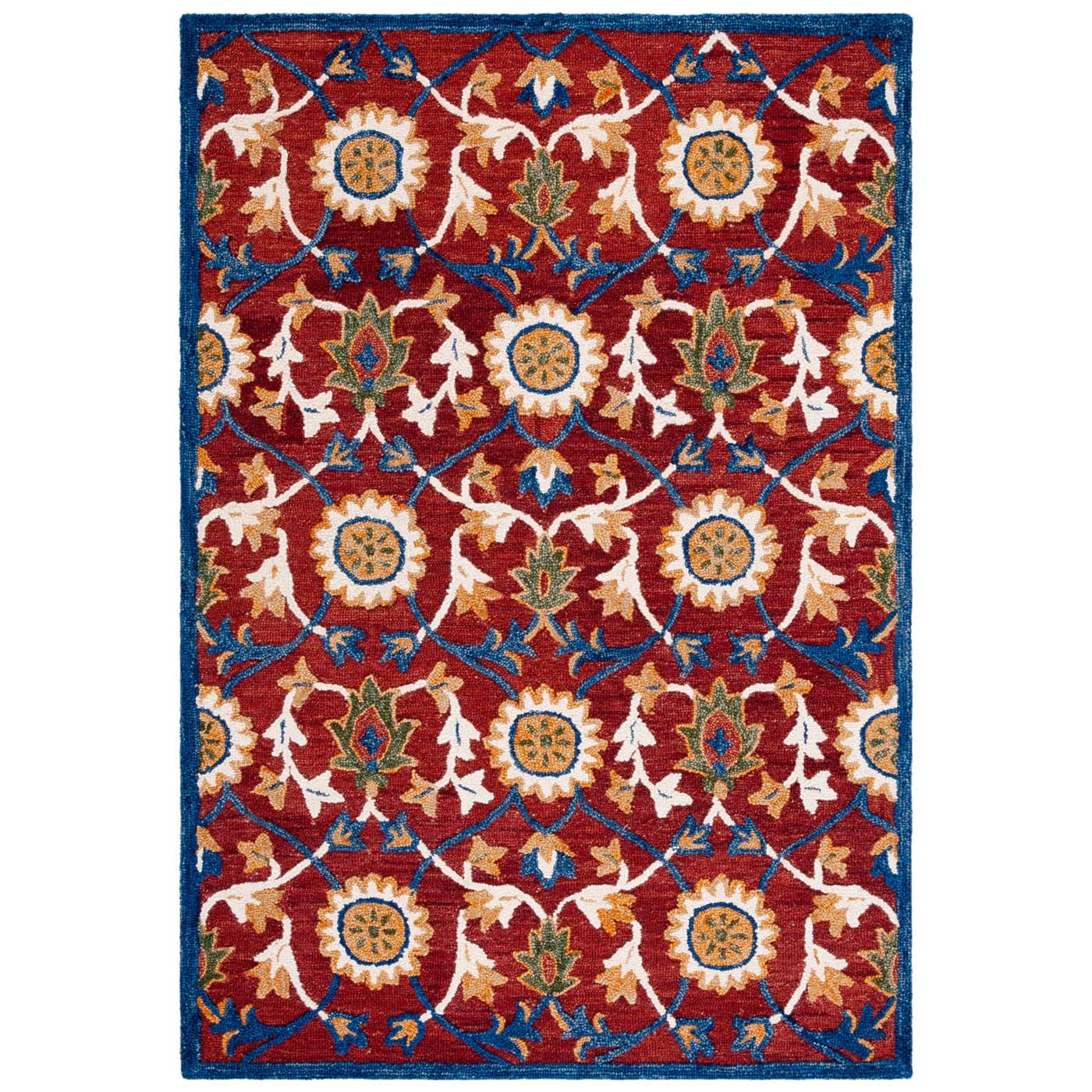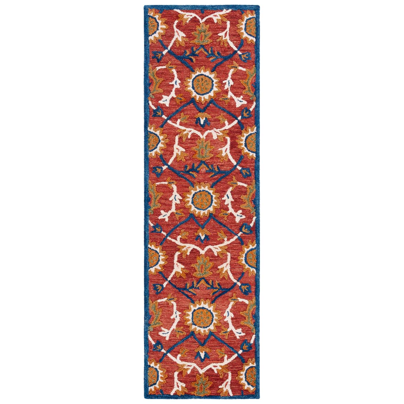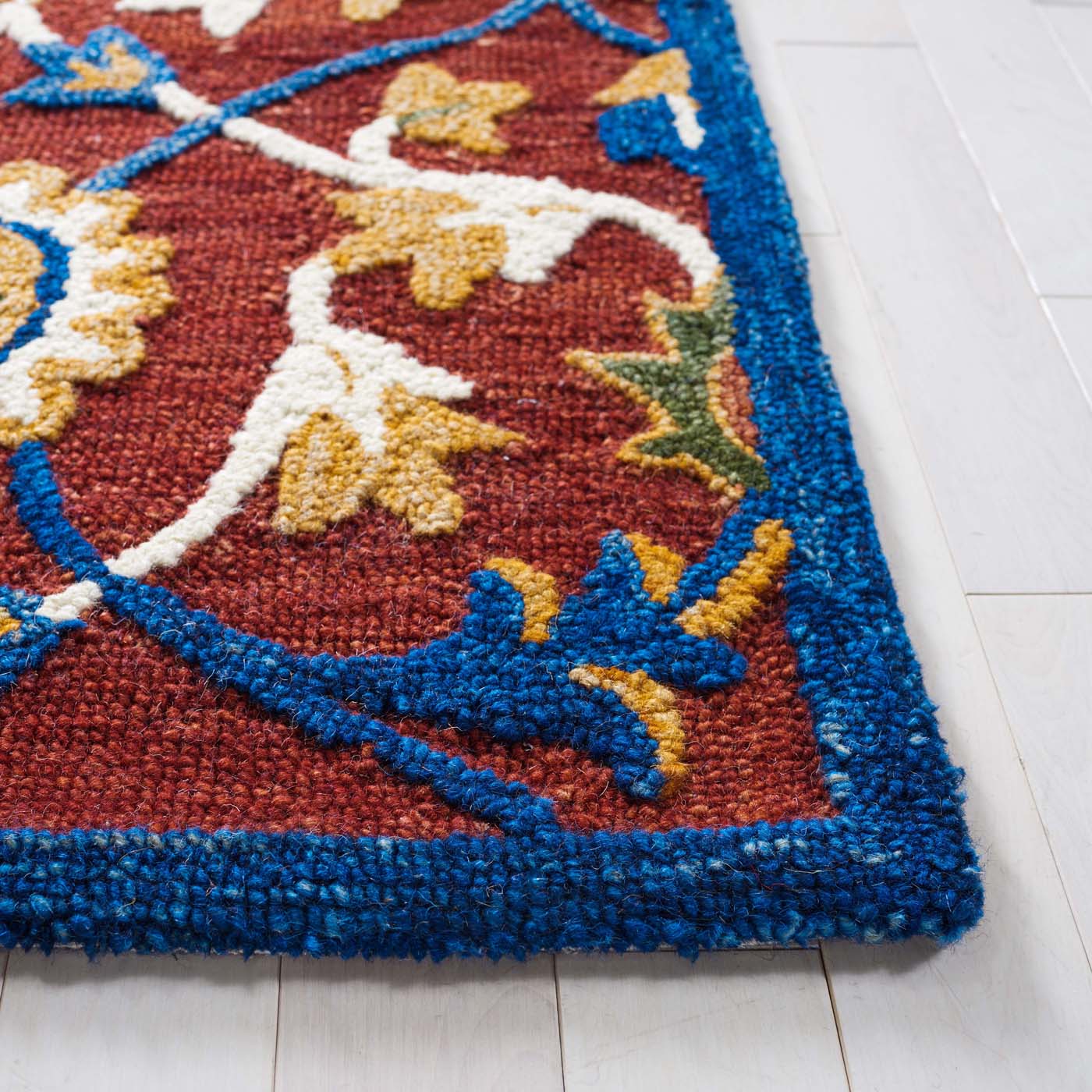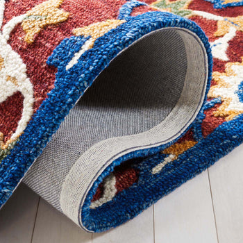 The rust and blue hues meld to create a palette that embodies both vibrancy and depth, invoking a sense of heritage with a modern twist. Hand tufted with precision, the rug showcases a luxurious height of 3/8" that promises a plush underfoot experience with every step.