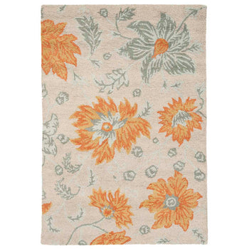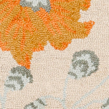 The rug features a charming botanical pattern, as shown in the image, set against an ivory background that exudes a sense of warmth and elegance. The multi-colored floral design is highlighted with autumnal shades of orange and touches of cool blues and greens, creating a versatile palette that complements a range of interior decors.