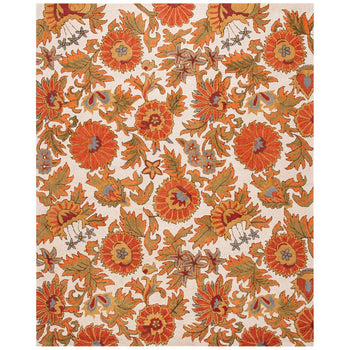At the heart of its design, our rug features a captivating floral motif that evokes the grace of nature's own artwork?a testament to the timeless craft of hand-hooked textiles. Its generous blooms and foliage in a harmonious blend of reds, yellows, and greens flourish against the serene ivory field, making it an eye-catching centerpiece for any room.