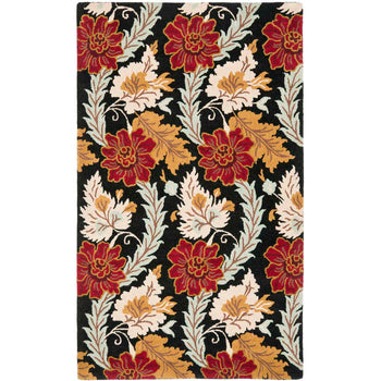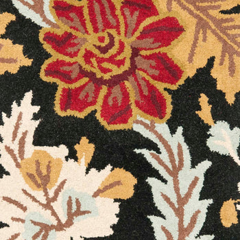 The luxurious black base of this rug comes alive with vibrant multi-colored floral patterns, featuring bold touches of red, beige, caramel, and subtle hints of light blue. These rich, warm hues are paired with the rug's lush materials to create a plush, welcoming presence in any room.