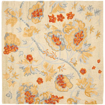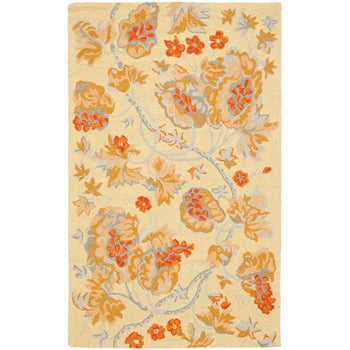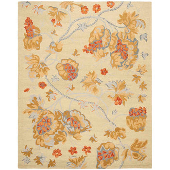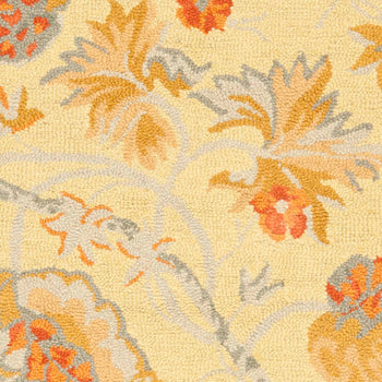 Our artisanal rug captures the eye with its serene beige background accented by a lively multi-color floral pattern, featuring shades of orange, yellow, and subtle blue, artfully intertwining to create a design that invites both comfort and sophistication into your home.