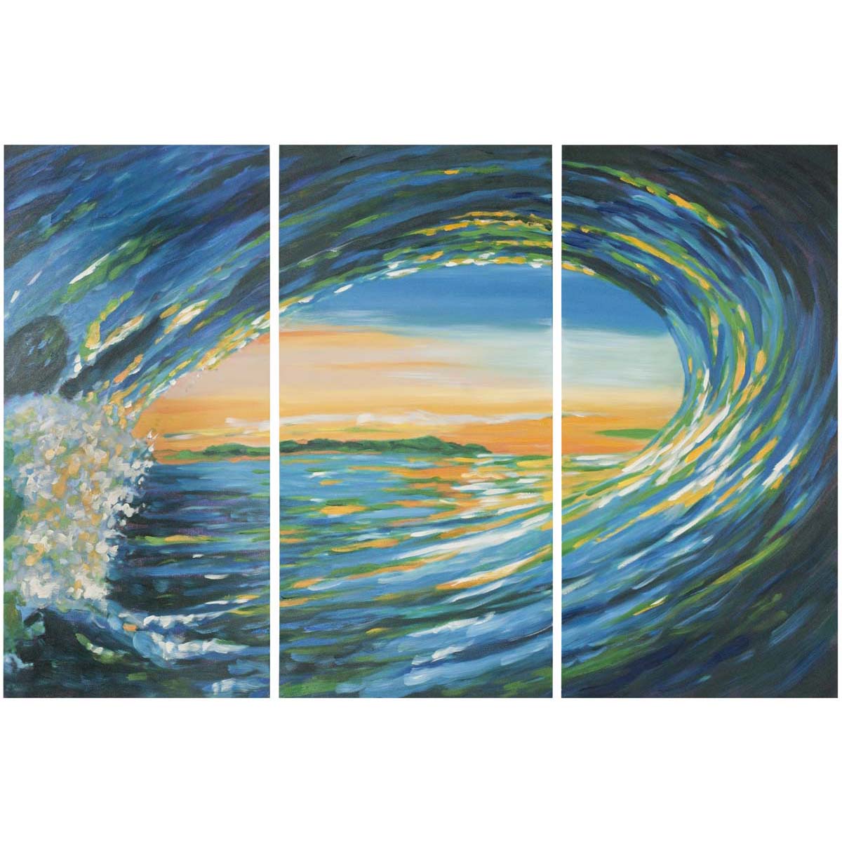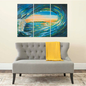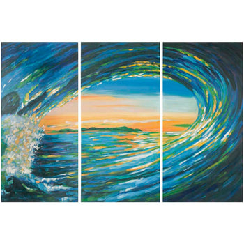 Catch the wave. Whether you'se capturing ocean memories or need a reminder of life's perpetual motion, this acrylic/oil painting is ideal. Vibrant colors in primary hues stretch across three canvases framed by sacred abies fabri wood from western China.