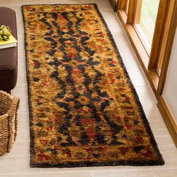 This small rectangle rug makes a grand statement with its charcoal and gold colors, exuding an understated elegance that complements a variety of decors. The deep charcoal hue provides a dramatic backdrop for the striking gold patterns that adorn the rug. These ornate motifs are reminiscent of classic designs, featuring intricate details that capture the eye and evoke a sense of historical grandeur.