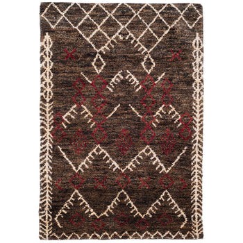 The rug's rich dark brown base is tastefully accented with a multi-colored geometric pattern, featuring hues of deep red and cream. The bold diamonds and intricate border design impart a feeling of timeless tradition with a modern twist.