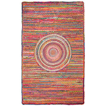 Meticulously crafted in India, this rug showcases a contemporary style that effortlessly complements modern interiors. Its exquisite pattern, drawn from the image provided, features a dynamic interplay of pink and red hues that radiate from the center, creating a captivating spiral effect against a backdrop of multi-colored stripes. Each stripe adds depth and a delightful burst of color to the rug, making it an eye-catching statement piece.