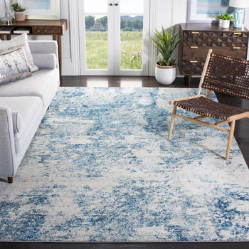 This rug?s allure is heightened by its plush 3/8" pile height, giving it a comfortable and soft underfoot that is perfect for your everyday needs. Its contemporary style is underscored by a stunning pattern, which flaunts an abstract blend of grey and navy shades, emanating an artful and dynamic aesthetic that will catch the eye of every guest. The design, as seen in the image, radiates a sense of motion and depth that will complement and uplift any modern interior.