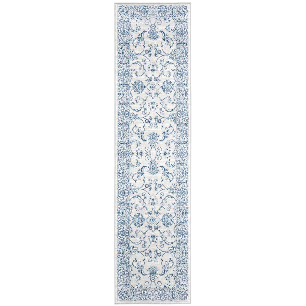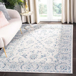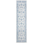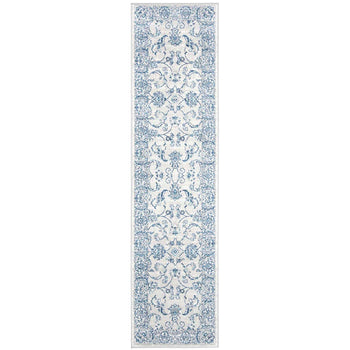 Featuring an elegant transitional style, this rug harmoniously blends modern sensibilities with classic patterns. The light grey backdrop is adorned with ornate blue florals and intricate scrollwork that capture the essence of a bygone era, delivering an air of sophistication to any room.