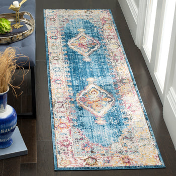The stunning blue and ivory palette is the canvas for a traditional rug pattern that features an elegant central medallion encased within a contrasting border, reminiscent of vintage treasures. Accents of warm and colorful hues breathe life into the design, creating a focal point that invites attention and compliments.