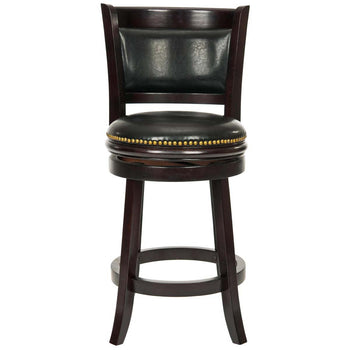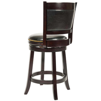 The Brockway Counter Stool is designed to give your home fashion and function with a frame crafted of Malaysian Oak with a cappuccino finish and a swivel seat covered in black bi cast leather. The seat back features an inset cushion, also covered in black leather, for comfortable sitting at counters and pub tables. The seat height is 24 inches. Assembly required.