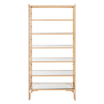 A gilded tower that displays all of life's treasures, this contemporary 7 tier ?tag?re is a classic. Designed with a bold quatrefoil pattern and clear shelves on each tier, its deluxe gold finish radiates good taste. Ideal for the living room or office.