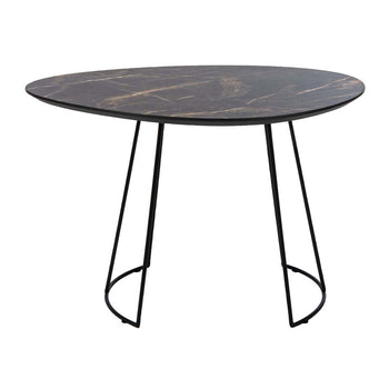 The lines and curves of contemporary art inspired this luxurious modern side table. Its elegant grey faux sandstone and black top is paired with a sleek, black iron base to create its cutting edge style. It's an instant focal point in any living room.