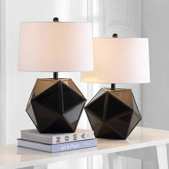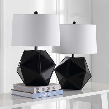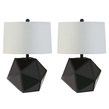 Inspired by the sophistication of modern minimalism, this contemporary table lamp is a focal point in any living room. Its substantial metal geometric design features a black finish that highlights its sculpted three dimensional triangles. Sold in sets of two.