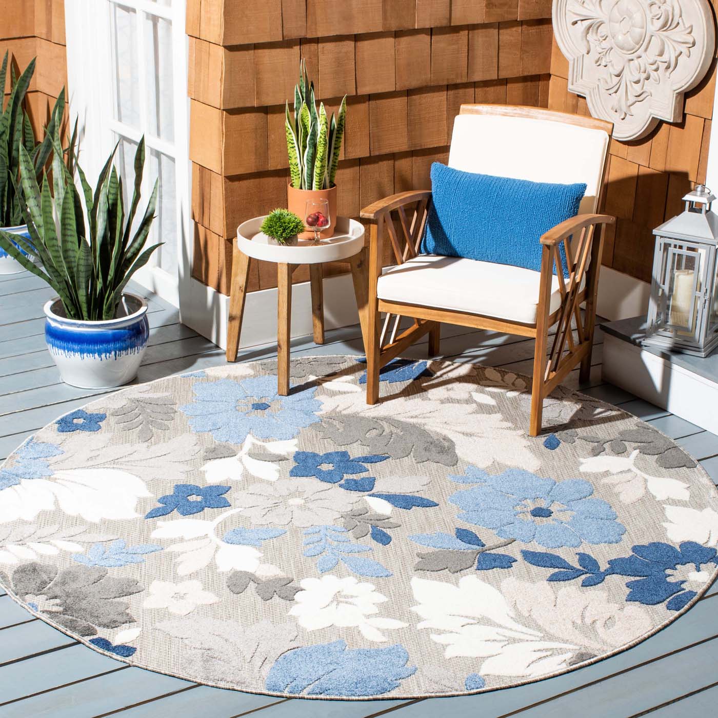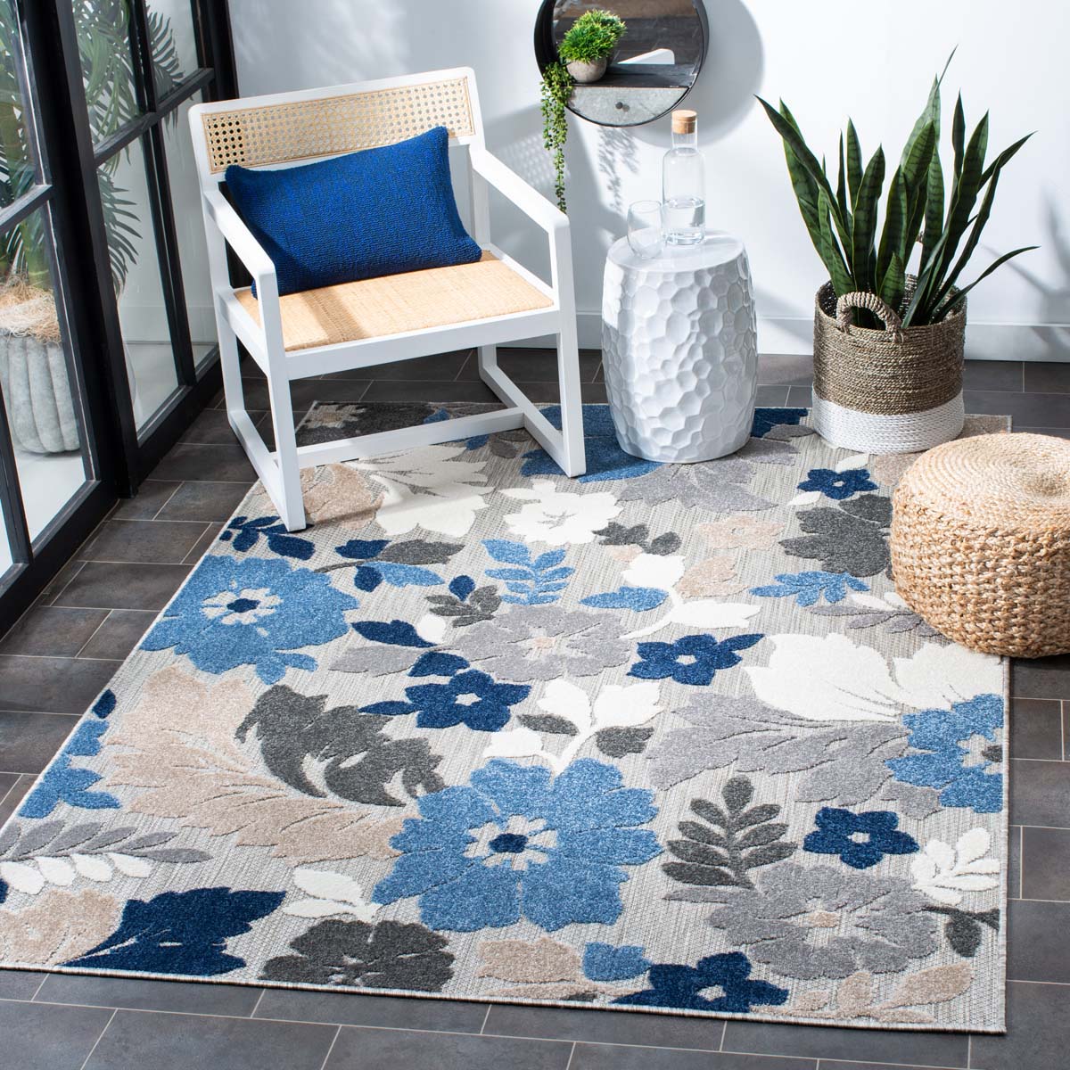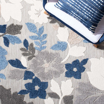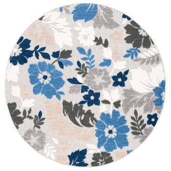 The rug showcases a charming floral pattern, blooming with various shades of blue complemented by neutral greys and whites, infusing your space with a serene and inviting atmosphere. The low pile height of 1/4" ensures ease of maintenance while providing a soft underfoot experience.