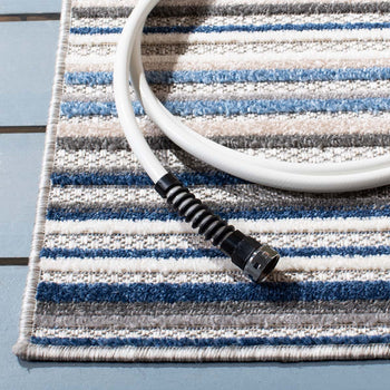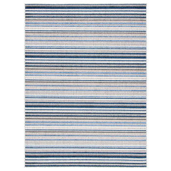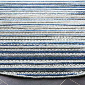 Elevate your indoor or outdoor living space with the timeless sophistication of our Grey/Blue Small Rectangle Area Rug. This versatile piece, measuring a convenient 2'-2" X 5', harmoniously blends the tranquility of grey with the serene essence of blue in a gracefully striped pattern that evokes a sense of calm and order.