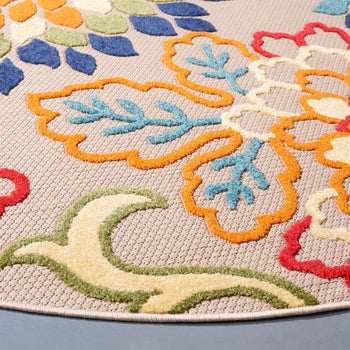 Introduce a burst of color and pattern to your space with our exquisite indoor/outdoor area rug. Crafted in the vibrant hues of ivory and orange, this round 3' x 3' rug emanates warmth and charm, making it a perfect accent for any area of your home or outdoor setting.