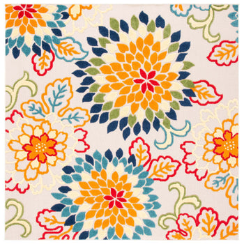 The rug's inviting pattern features an intricate display of large blooming flowers in shades of orange, yellow, and red with complementary accents of green and blue leaves all set against a serene ivory background. The design offers a timeless appeal, bringing a touch of garden beauty into your home.
